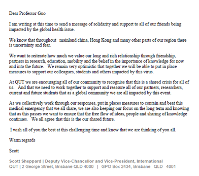 近日,公司收到澳洲合作院校领导发来的慰问邮件,昆士兰科技大学副董事长Scott Sheppard及昆士兰大学商公司副经理Andrew Griffiths就防疫抗疫期间海内外师生面临的生活和学习上的困难表达了问候之心和共度时艰之意。为确保正在进行的合作项目不受过多影响,尽量减少此次疫情影响之下海内外师生的生活和学习的不便之处,两校已通过官网、邮件、公众号等渠道为当前受疫情影响的员工提供了贴心的对策或建议,鼓励员工通过网络渠道进行信息登记,做好选课准备和网上学习等,相信在大家的共同努力之下,疫情结束之后定能早日恢复正常的学习生活。