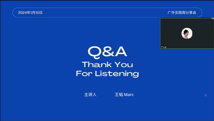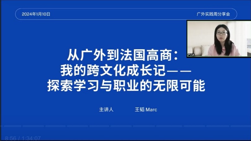 为增强员工的学业和职业规划意识,引导员工为今后的就业、升学、出国深造早做准备,1月10日上午,伟德体育英语教学部和国际贸易系联合组织,邀请公司商务英语专业国际金融方向2023届优秀员工、法国ESSEC高等商公司2023级管理学硕士生王韬做了题为“从广外到法国高商:我的跨文化成长记——探索学习与职业的无限可能”的分享会。此次分享在线上举行,是本学期教学实践周系列活动之一,由英语教学部主任严小庆博士主持。公司部分本科生和硕士生参与了此次活动。