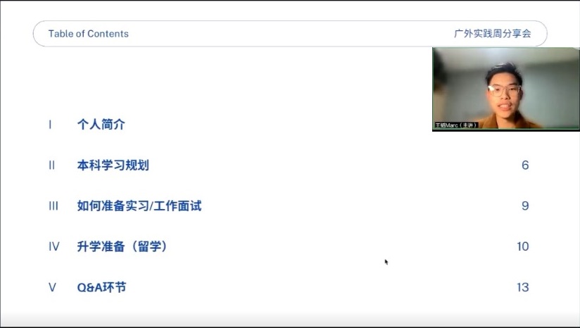 分享会上,王韬结合自己大学四年的生涯,介绍了每个学年的重点任务和经验,从保持高GPA,打牢英语听说读写基本功及学习方法,参加社团活动,参加各种商赛和挑战杯等赛事,寻找实习机会,选择公司的交换生项目,进行保研考研考公就业抉择,简历制作,应聘的面试准备和技巧,到升学准备等主题分享了宝贵经验。王韬认为,同学们在大学期间应充分利用实习机会建立和拓展职场交际圈,学会如何在实习和学业之间找到平衡,根据个人兴趣和优势找准定位,并希望同学们可以跳出思维常规,走出独一无二的精彩道路。