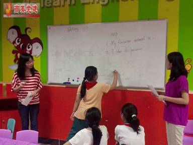 六年级的小老师们则用互动教学法,教授有关动物的单词:让每个小朋友都到黑板上写出自己喜欢的动物的英文单词。小朋友们围绕在黑板旁,期待着写喜爱动物单词的场面,真是温馨而有趣。