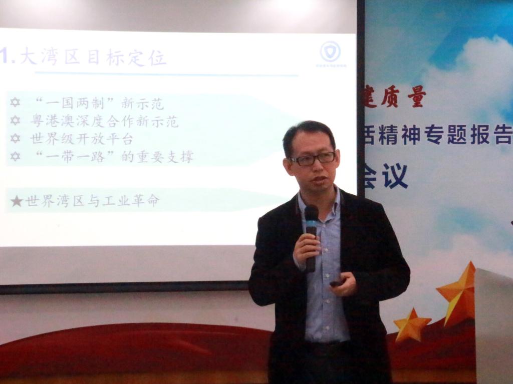 随后,申明浩为全体与会师生党员作了学习贯彻习近平总书记视察广东重要讲话精神的专题报告。报告深入讲解了习近平总书记对广东深化改革开放的要求和希望,并对总书记高度关注的粤港澳大湾区战略进行了全方位的解读。