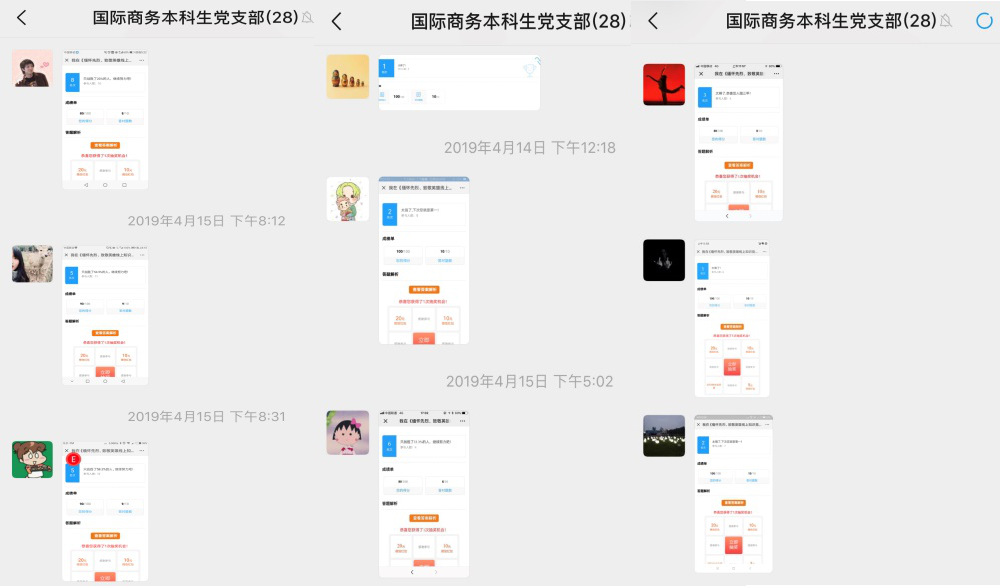 在郑锋同志的组织下,大四党员们纷纷开展线上知识竞赛,先后迅速准确地完成问卷,丰富了对革命先烈的精神认同和崇高敬仰。