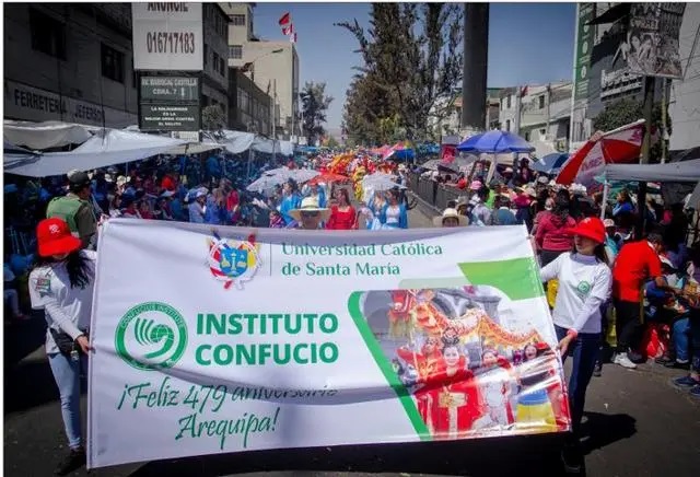 彭启贵:每一年的8月15日是阿雷基帕的建市纪念日,人们在这里狂欢,观看花车游行。阿雷基帕城市不大,但是当地人都对自己的城市非常有自豪感,人们认为那一天就如同城市独立日一般,所以这个纪念日很隆重。每一年的这天全市放假,所有人会都会前往参观花车游行,可以说是万人空巷,我们认为这是一个难得与当地人进行深入文化交流的机会。每个单位都要组织花车,但是因为大家每年看到的花车都比较类似,会出现审美疲劳。所以我们大学就由我们孔子公司主导,每年制作“中国风”的花车,比如打造带有“龙”形象的中国文化花车,而且我们孔子公司的老师们也会跳中国舞,这种形式对当地人来说比较新颖。此后,我们规模越来越大,有一次正好四川熊猫文化公司在办灯盏中心,我们知道自贡的灯盏比较有名,所以就借这个机会把他们请过来给我们做了熊猫样式的灯,同时请他们的人表演川剧变脸这些特色中国文化,声势就更加浩大了。