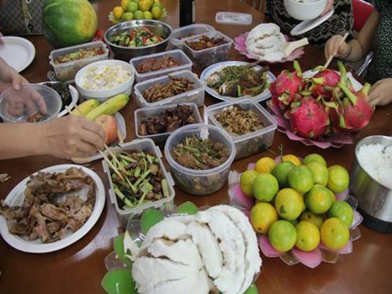 室内正中的台桌上摆满了老师们的精心准备的菜肴:怪味凤爪、啤酒鸭、清蒸鱼、凉拌海带、手撕鸡、雪花牛肉、水果色拉、凉拌青瓜、八宝饭……在约定的12点还未到的时候,已有老师抵挡不过诱惑,不断“试吃”。而当香勤老师的馒头出现时,现场骚动,群情热烈,大有春运抢火车票的态势。整个楼道回荡着老师们的笑声,谁也听不清对方说什么,但满面的笑容和满嘴的食物已说明了一切。辛苦了好几个月的老师终于可以肆无忌惮地像孩子一样放松,生活多美好!