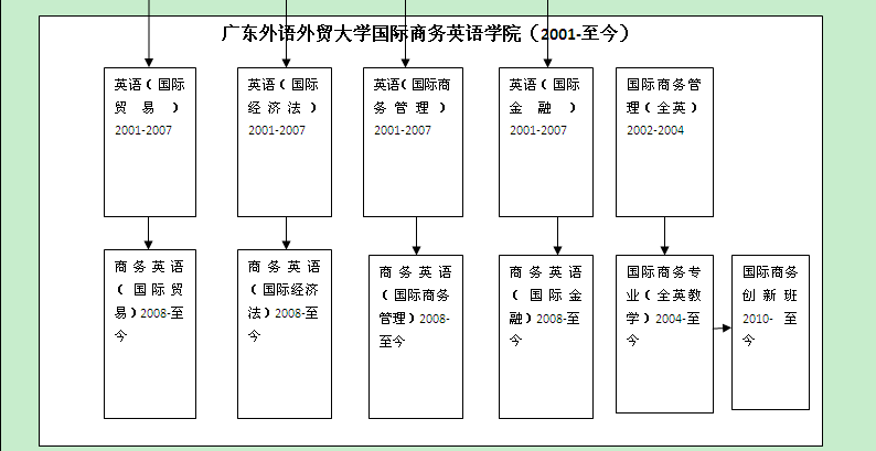 成立之初设有英语(国际商务管理)、英语(国际贸易)、英语(国际金融)和英语(国际经济法)专业,2002年9月在英语(国际商务管理)专业的基础上开办了国际商务管理(全英)专业,经教育部批准,公司从2004年起开设国际商务(全英教学)本科专业;自2008年起开设商务英语本科专业,原英语专业各方向的名称分别改为商务英语(国际商务管理)、商务英语(国际贸易)、商务英语(国际金融)、商务英语(国际经济法),以更好地凸现公司“英语 + 商务”的人才培养特色,突出公司培养“具有国际视野和创新意识,能直接参与国际竞争与合作的国际通用型人才”的人才培养目标,满足社会经济发展对高级商务英语人才的需求。